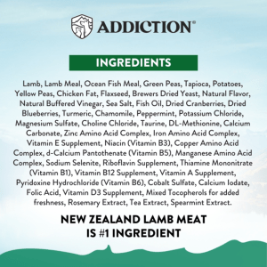 Lamb, Lamb Meal, Ocean Fish Meal, Green Peas, Tapioca, Potatoes, Yellow Peas, Chicken Fat, Flaxseed, Brewers Dried Yeast, Natural Flavor, Natural Buffered Vinegar, Sea Salt, Fish Oil, Dried Cranberries, Dried Blueberries, Turmeric, Chamomile, Peppermint, Potassium Chloride, Magnesium Sulfate, Choline Chloride, Taurine, DL-Methionine, Calcium Carbonate, Zinc Amino Acid Complex, Iron Amino Acid Complex, Vitamin E Supplement, Niacin (B3), Copper Amino Acid Complex, d-Calcium Pantothenate (B5), Manganese Amino Acid Complex, Sodium Selenite, Riboflavin Supplement (B2), Thiamine Mononitrate (B1), Vitamin B12 Supplement, Vitamin A Supplement, Pyridoxine Hydrochloride (B6), Cobalt Sulfate, Calcium Iodate, Folic Acid, Vitamin D3 Supplement, Mixed Tocopherols (for freshness), Rosemary Extract, Tea Extract, Spearmint Extract.