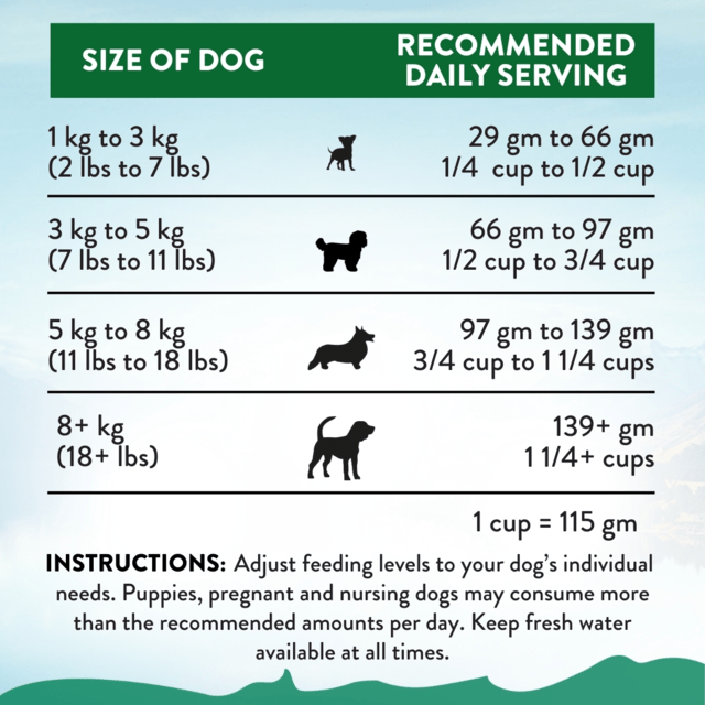 1 cup = 115g (4 oz). Always adjust portions based on your dog’s age, weight, activity level, and overall condition. Puppies, pregnant, and nursing dogs may require more food. Fresh water should be available at all times.