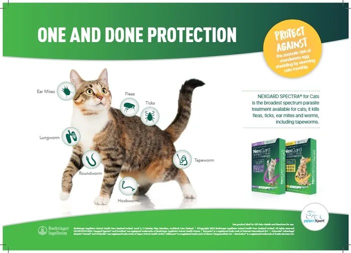 NexGard Spectra for Cats offers the most comprehensive parasite protection available in New Zealand, targeting both internal and external parasites in a single, easy-to-use monthly spot-on treatment.